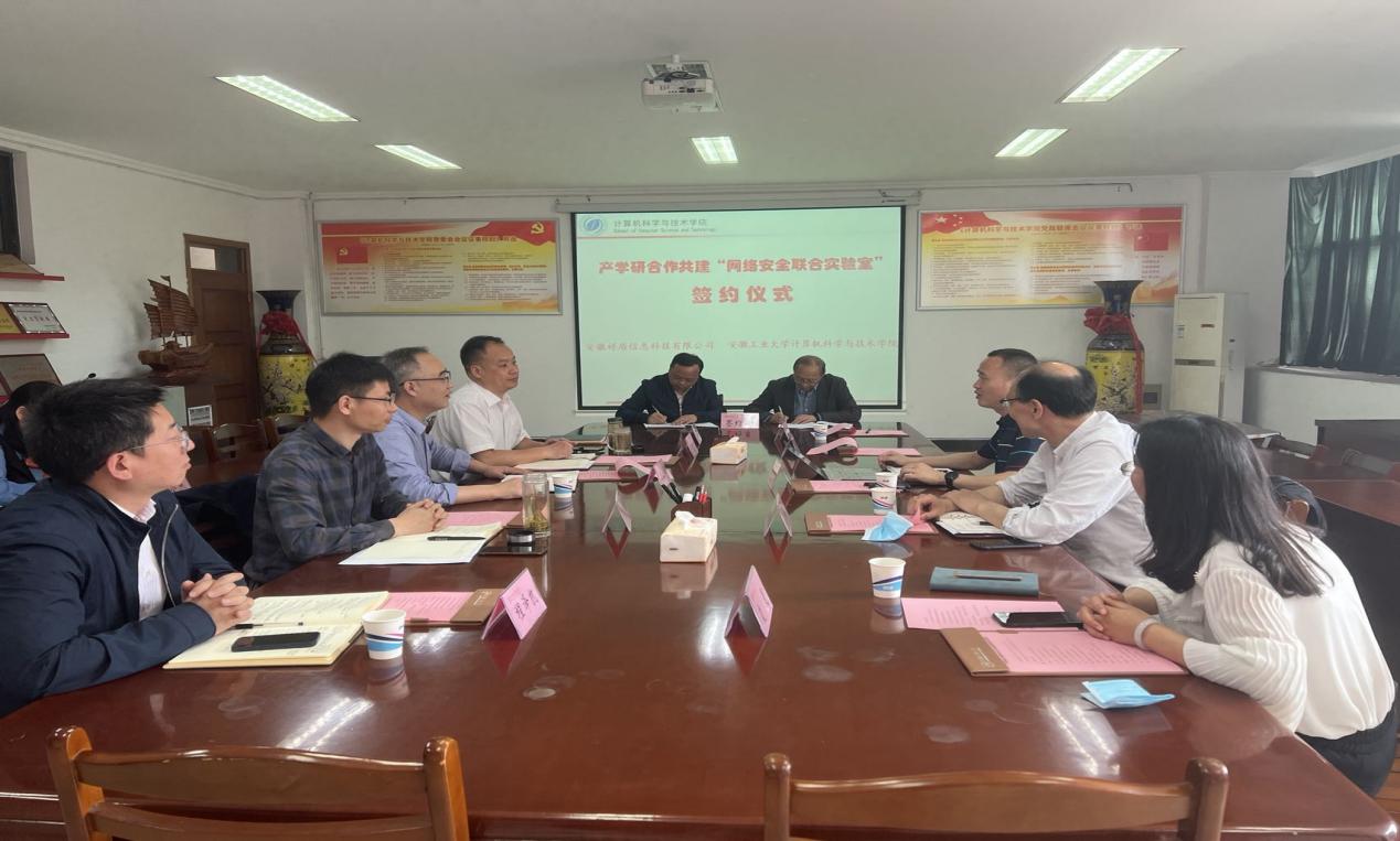 5月20日上午,飞马智科信息技术股份有限公司副总经理何诗兴、安徽祥盾信息科技有限公司总经理张多福一行5人来公司参加“产学研合作暨员工实习实训基地”的签约挂牌和党建交流活动,公司领导班子成员、软件工程系和省工业互联网智能应用与安全工程实验室相关人员参加会议,会议由公司党委副书记、副经理、纪委书记韩军书主持。