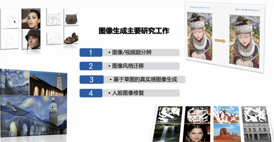 刘恒在此次专题报告中介绍了数字艺术智能创作在消费电子产业和智能信息产业领域的交叉应用和发展。首先讨论OpenAI和谷歌图像生成应用以及基本深度生成模型的基础上,然后介绍了研究室近几年在图像/视频超分、图像风格迁移、基于草图的真实感图像合成和人脸图像修复方面的初步探索工作。