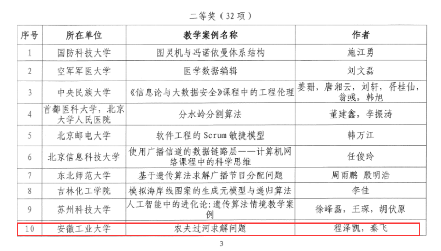 近日,由教育部计算机课程思政虚拟教研室、桂林电子科技大学主办,课程思政虚拟教研室成员高校承办的第二届全国高校计算机课程思政教学案例设计大赛举行。公司程泽凯老师、管工公司秦飞老师申报的《农夫过河求解问题》课程思政案例获二等奖。