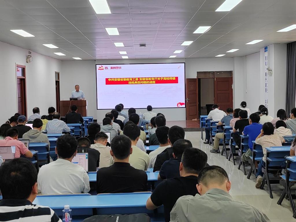 会上,夏玉钦带领全体教师学习了习近平总书记对“十五五”规划编制工作作出的重要指示和习近平总书记重要文章《加快建设教育强国》;传达学习了中央层面关于严重违反中央八项规定精神典型问题的通报和6月1日安徽省委常委会会议精神等。组织学习了校第五次党代会的主要精神,通报了公司近期的重要事项和重要成果,公司前期的重点工作和取得成效。通报了中共安徽省委教育工委安徽省教育厅关于高校师德违规典型问题案例。
