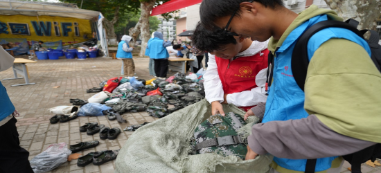 图为志愿者回收志愿者服装
