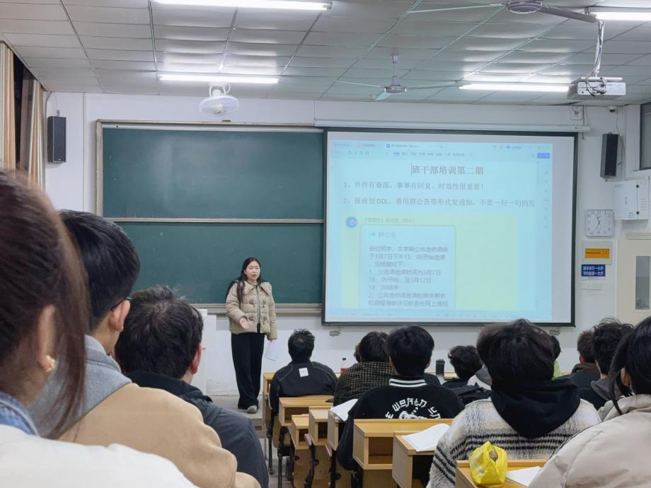 会上,奚锡珍首先明确了员工干部的角色定位和职责所在,作为员工干部要明确职责、合理分工、相互配合,在自己的岗位上发挥最大效能。同时她强调员工干部应当成为学风建设的引领者,通过自身的模范行为影响和带动同学们的积极性,共同营造积极向上的学习氛围。随后,朱筱对员工干部提出了具体的要求,明确班干部要有“找准定位、加强学习、认真负责”的工作态度,加强信息沟通,及时反馈工作中的问题和建议,主动承担并确保各项任务的完成。最后朱筱对培训会进行了总结,并期望所有员工干部谨记本次会议内容,并将培训中学到的知识和技能运用到实际工作中。