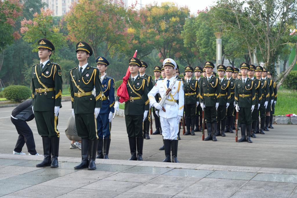 早6时许,全体师生学员在广场列队等候国旗队入场。7时,迎着初升的朝阳,校国旗护卫队的旗手们整齐列阵、气宇轩昂,踏着整齐划一的铿锵步伐,护送国旗行进至升旗台。“升国旗,奏唱国歌!”洪亮的口令响彻长空,升旗手振臂扬起国旗,五星红旗冉冉升起,师生们向国旗行注目礼、唱国歌。